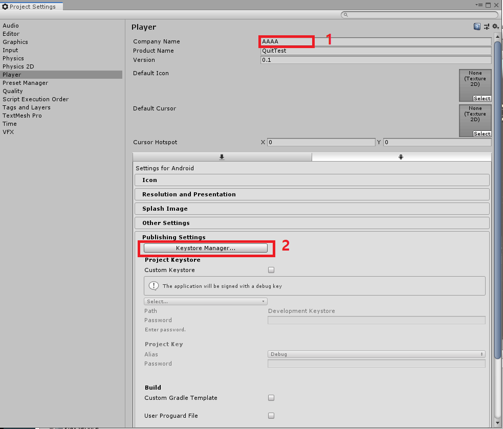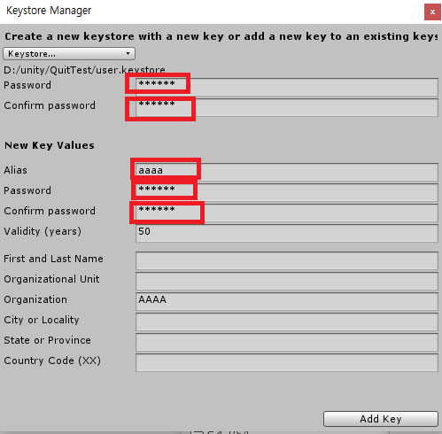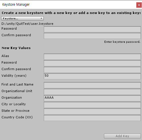 그리고 다음과 같이 Company Name을 지정하고. Keystore Manager...버튼을 누릅니다.