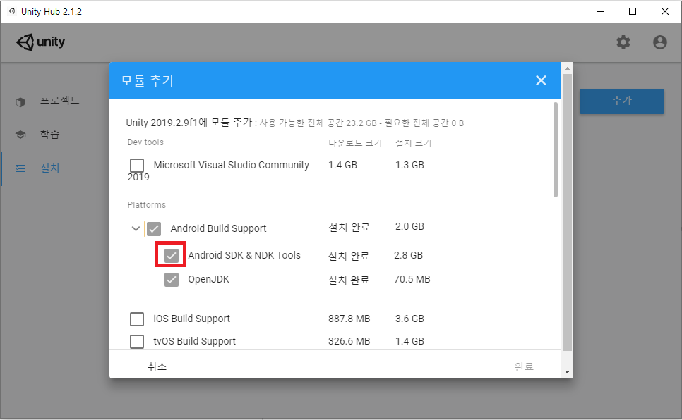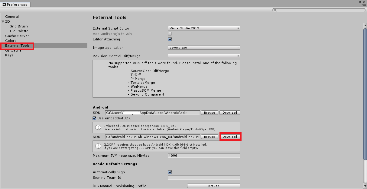 유니티 빌드 중에 "unable to locate android ndk" 메세지박스가 출력되는 경우