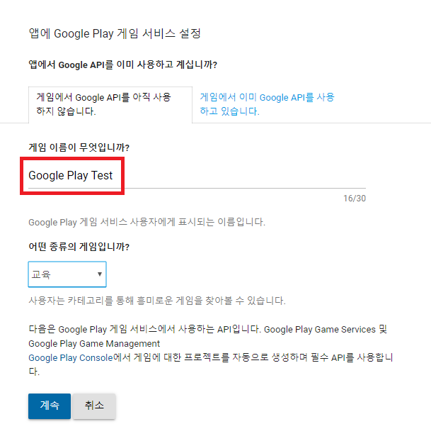 저는 "Google Play Test"라고 게임 이름을 만들었습니다.