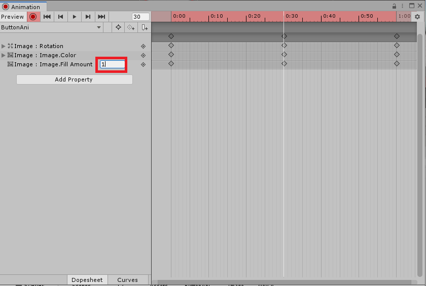 그리고 30 프레임으로 이동해서 Fill Amount값을 0에서 1로 변경합니다.