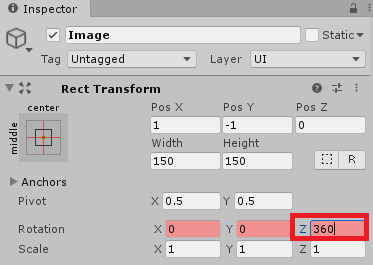 그리고 Rect Transform에서 Rotation값을 360으로 변경합니다.