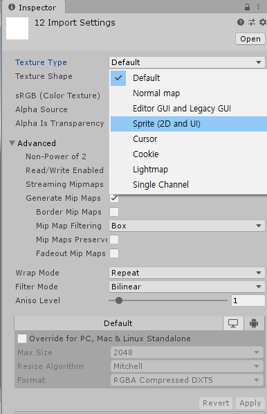 새로 만든 이미지를 선택해서, Texture Type을 Sprite로 변경한 후 Apply버튼을 누릅니다.