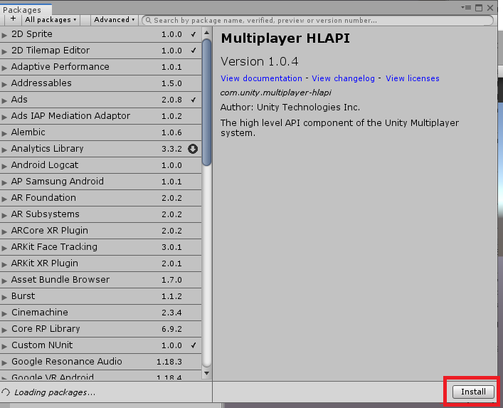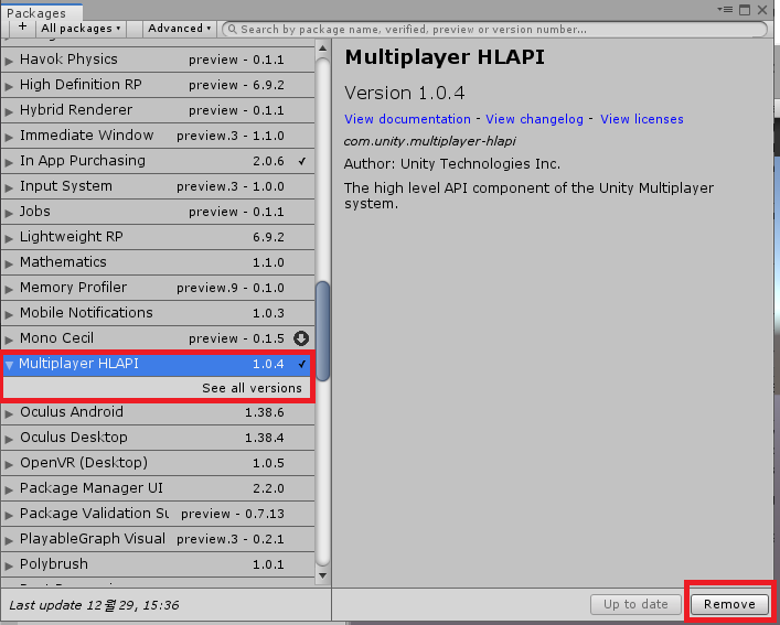 Package Manager에서 MultiPlayer HLAPI를 찾은 후 삭제(remove) 후 다시 설치(Install)합니다.