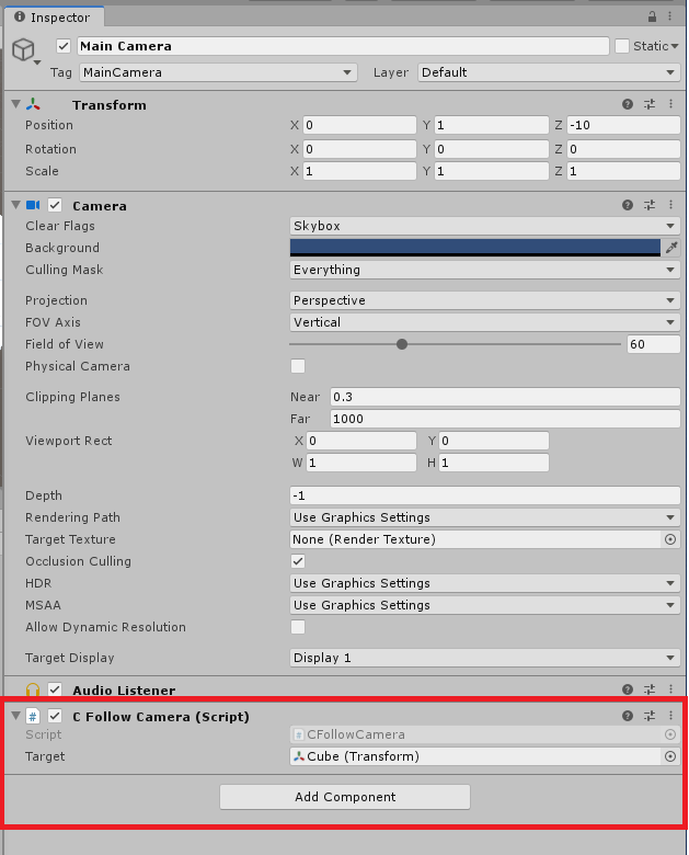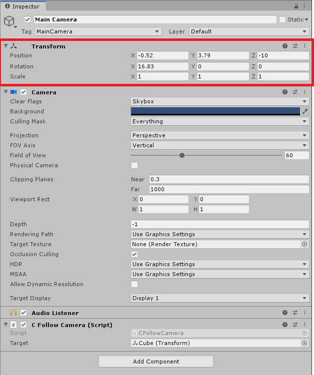 다음은 메인 카메라(Main Camera)에 오브젝트를 따라가는 스크립트를 추가합니다.